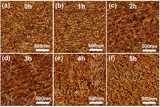 Atomic force microscopy (AFM) phase images of P3HT films prepared by spin-coating P3HT solutions exposed to methanol vapor for (a) 0, (b) 1, (c) 2, (d) 3, (e) 4, and (f) 5 h, respectively.