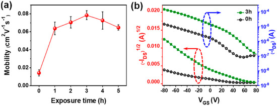 To investigate how the non-solvent vapor treatment affected the charge transport behaviors of P3HT films, OFET devices with a bottom gate and bottom contact structure were fabricated by spin-coating the respective solutions onto device substrates, where the transistor channel width was 2000 μm and the length was 50 μm. Figure 5a shows the trend in field-effect mobilities of the resulting P3HT films as a function of non-solvent pre-treatment exposure time. The mobility dramatically increased by ~5.6-fold (i.e., from 1.4 × 10−2 to 7.8 × 10−2 cm2 V−1 s−1) as the exposure time was increased from 0 to 3 h. Interestingly, further increases in exposure time (up to 5 h) led to a decrease in the mobility to 6.5 × 10−2 cm2 V−1 s−1, despite the improved molecular ordering of the resultant films as substantiated by UV-vis spectroscopy, POM, and GIXRD analyses. This reduction is possibly a result of the excess amount of methanol favoring solute nucleation over crystal growth. As a result, the number of interfaces between crystalline regions would increase, resulting in an increase in the number of grain boundaries (i.e., the number of interfaces between crystallites) that hinder efficient charge transfer (Figure 4e,f) [7,35,36]. Figure 5b displays charge transfer curves for OFETs prepared from P3HT solutions pre-treated with methanol vapor for 0 and 3 h, and the curves obtained are characteristic of p-channel OFETs in accumulation mode. The drain current (IDS) was ~1.5 × 10−5 A for the pristine P3HT OFET, but ~10 times higher for the OFET prepared from the solution pre-treated for 3 h (~1.5 × 10−4 A). This increase is a result of the nanofibrillar P3HT aggregates formed by strong interchain interactions owing to the methanol vapor pre-treatment, which act as pathways for efficient charge transport within the film. Higher turn-on voltages (VON) were observed in the OFET devices based on the pre-treated P3HT films than in those based on the pristine films, which was ascribed to the influences of additional doping and/or charge trapping at the interfaces between crystalline domains [5,37].