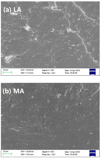 The cryo-fractured surfaces of the starch-based nanocomposites with different amylose contents were characterized by SEM (Figure 1). It was previously reported that propionylated starch with high DSs (2.27 and 2.61) tended to form smooth surfaces [35], whereas others have disclosed that, with a high content of amylose, starch-based films displayed an increased surface roughness [36]. In the present work, generally, the continuous cross-sections were displayed and implied a well interfacial adhesion between nanofiller and starch matrix. However, white granules and small aggregates were scattered throughout the matrix of starch-based films; some rough textures were still observed in the HA film. To comparatively speculate, the linear amylose could more easily interact with each other to facilitate the formation of compact structures. This competitive behavior necessarily weakened the interaction between the nanofiller and starch, which could lead to more heterogeneously wrinkled structures.
