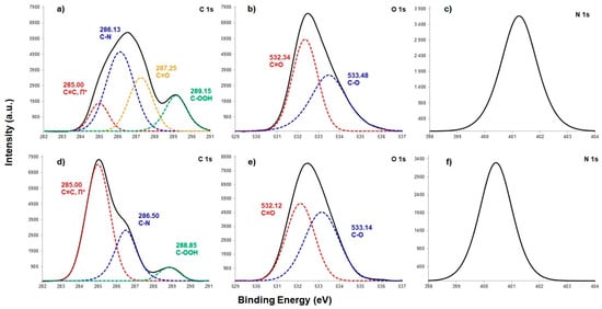 C1s (a,d), O1s (b,e) and N1s (c,f) spectra of PES/PA-TFC (a–c) and PES/PA-TFC-SP (0.2 wt %) (d–f) as determined by XPS.