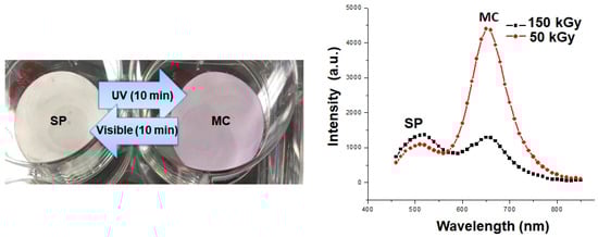 In order to further confirm the presence of SP on PES/PA-TFC, the photographic images of PES/PA-TFC and PES/PA-TFC-SP membranes could be considered as shown in Figure 6 (left). The white PES/PA-TFC-SP membrane became purple by isomerization of SP to MC using UV light (366 nm). After exposure to visible light, the SP form is regenerated and the membrane appears white again. Obviously, SP and MC differ markedly in their light absorption behavior. Therefore, light absorption measurements have been conducted (Figure 6 right). While the SP isomer exhibits strong absorption peak at λmax ≈ 500 nm the MC form shows an intense absorption band centered at λmax ≈ 650 nm. We also optimized the EB dosages (50 and 150 kGy) in order to check an appropriate EB energy for covalent immobilization of SP onto PA-TFC membrane. A very high absorption intensity of MC was recorded in case of a low EB dose of 50 kGy as compared to higher EB dose of 150 kGy upon SP irradiation at 366 nm. Therefore, 50 kGy of EB dose was taken into consideration for further experiments.