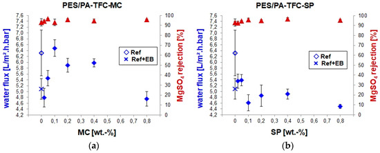 The reference membrane (PES/PA-TFC) exhibited water permeability around 6.3 L/(m2·h·bar). Upon EB modification of PES/PA-TFC, water permeability decreased to around 5.0 L/(m2·h·bar). Since EB activation causes cross-linking within the membrane polymer [10], it might shrink the pore diameter and make the membrane surface more dense than the reference PES/PA-TFC membrane. The SEM images of the PES/PA-TFC revealed a rough PA layer formation, whereas ridge-and-valley surface morphology was observed in the case of EB-irradiated PES/PA-TFC membrane (see Section 3.1.1). However, the water permeability of PES/PA-TFC-MC membranes was further reduced to around 4.7 L/(m2·h·bar) at very low as well as at the highest tested MC concentrations of 0.02 and 0.80 wt %, respectively. All other remaining PES/PA-TFC-MC membranes showed higher water permeability, they were even higher, i.e., 6.5 L/(m2·h·bar) for the 0.1 wt % MC compared to the reference membrane. Within this optimized MC concentration range, the hydrophilic character of the ionic MC (Figure 1) present on the membrane surface leads to an improved flux of the membrane. This is higher than the previously published NF membranes [15] NTR7450 [16] and commercial AFC40 [17]. These water fluxes were achieved without the loss of ion selectivity as all investigated membranes had a MgSO4 rejection >95%.