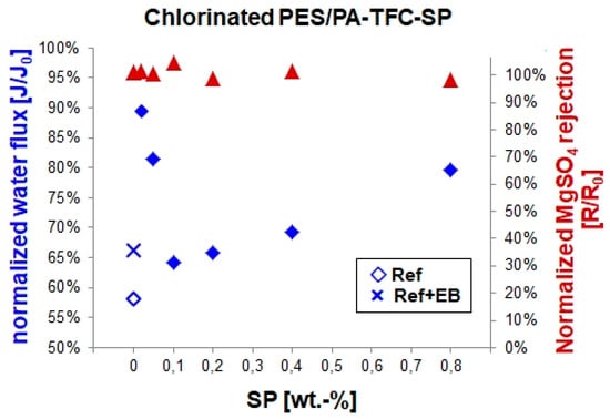 Normalized water flux and MgSO4 retention of the reference, EB-modified and PES/PA-TFC-SP membranes after chlorination.