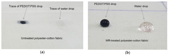 Drops of water and PEDOT:PSS polymer dispersion on (a) untreated fabric and (b) water repellent (WR)-treated fabric.