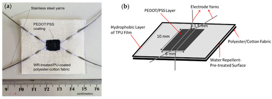 Nine devices with different combinations of types of electrodes and electrolyte plus three so-called blank devices (see Table 1) were prepared on 5 × 5 cm2-sized water repellent (WR)-treated fabric. The cell area, which comprised of a pair of electroconductive yarns and drop-coated PEDOT:PSS film, was created by masking a layer of TPU film (thickness of 25 µm) to the fabric by a heat press at 100 °C for 2 min. The TPU film had at its center a rectangular hole of 6 mm to 10 mm to create an unmasked region and a confined area for the subsequent drop coating of PEDOT:PSS polymer dispersion. Before the drop-coating procedure, a pair of electrode yarns, as set for each device (Table 1), was stitched at a distance of 1.5 mm apart in the middle of the cell area (See Figure 2b). An initial test by multimeter was performed on each device to make sure that there was no short circuit due to the contact between the stitched yarn electrodes. The drop coating of PEDOT:PSS was performed as described in the previous work [36]. However, in this study, a slight technical modification was done for the PEDOT:PSS coating method due to the hydrophobic surface properties of the fabric leading to having less amount of PEDOT:PSS polymer used for each device. With the perfect hydrophobicity on the fabric surface, there was no diffusion of the diluted polymer into the pores of the fabric as visually observed in the previous devices [33,34,35], and therefore, all polymer dispersion dropped into the cell surface could be completely distributed on the surface of the cell area. This way, instead of having seven drops, as described in the previous works, five drops were sufficient to cover the cell area. As performed previously [34], drying of film was attained in the oven at 100 °C for 10 min layer by layer between each drop. During the coating procedure, the polymer dispersion was kept in the oven in order to make it more concentrated over time. After the fourth drop, the polymer dispersion had formed a paste, and thus, for the last coating, the paste was simply swept by a mini squeegee to improve the distribution. An example of the actual device can be seen in Figure 2.