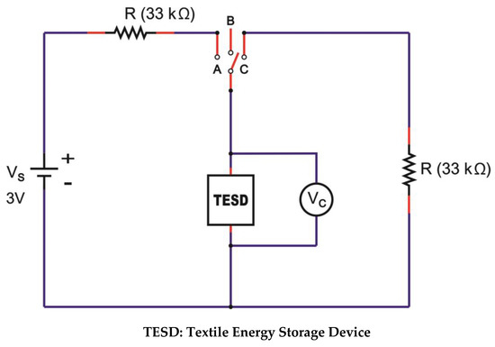 Charge-discharge characteristics of all devices were measured by using a microcontroller “Arduino/Genuino-Uno”, which was set up specifically for this particular purpose with the circuitry shown in Figure 3. The charging of the device was done by switching to position A which supplied the device with a DC voltage (Vs) of 3 V with an external resistance of 33 kΩ (R). The charging process was stopped by switching to position C after 1500 s when the voltage reading (Vc) reached a maximum and remained stable at that level. This charging time was taken as our standard charging time based on our preliminary study. Discharging took place with the same external resistance of 33 kΩ (R). During the process of charging and discharging, the output voltage (Vc) was recorded automatically by the program. The position of the device is presented by the name TESD, which stands for the textile energy storage device. The hypothetic details of the schematic circuit of the TESD cell are presented in Section 3.3 of this paper.