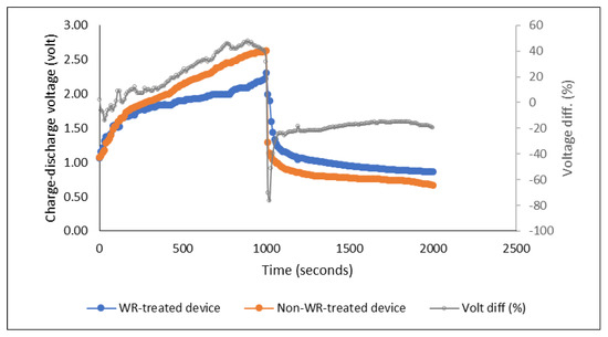Charge-discharge profile of the water repellent- versus non-water repellent-pre-treated devices (“Volt diff” shows the difference of charge-discharge voltage of the two compared devices recorded along the measured times).