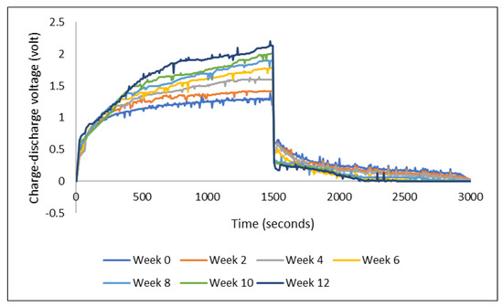 The presence of sulfonic acid groups in PEDOT:PSS represents the strong hygroscopic characteristic, which allows the formed film to easily take up moisture in the ambient condition [21]. Based on visual observation, the PEDOT:PSS film on our device did not seem to undergo visible swelling under ambient condition during the three months storage. However, there was a consistent change in the charge-discharge performance: the voltage level of charging increased while the discharging voltage level decreased with storage time (Figure 7). Graphs in Figure 7 show the results from a series of consecutive measurements of a device made of PEDOT:PSS Ossila AI 4083 and stainless steel electrode yarns. The device was first measured just after it was made, week 0, and then it was stored in room conditions for the next measurements after every two weeks until week 12. The charge-discharge voltage was measured with the Arduino-Uno (charging at 3 V for 1500 s and discharging for another 1500 s).