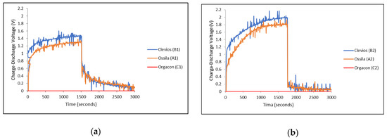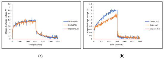 As can be seen in Figure 8a,b, devices using a pair of Ag/PBO electrode yarns exhibited higher charging voltage at 1500 s than those using SS electrode yarns, but lower discharging voltage. Following our previous argument in Section 3.2, this means that the internal resistance of our TESD is higher when using Ag/PBO yarns as the electrode material. As the only difference is the electrode, this indicates that Ag/PBO has a higher resistance than SS yarns. It can be observed that Figure 9a shows a similar discharge behavior as in Figure 8a, whereas Figure 9b is similar to Figure 8b. Comparing the two sets of figures provides an explanation of the different behavior caused by the use of different electrode materials as well as the role of their internal resistance to the performance of the device. In the devices having an asymmetrical configuration of electrodes SS/Ag-PBO, the electrode resistance of current flow from PEDOT to Ag was apparently high. As current flows from positive to negative and electrons in the opposite direction, when SS was set to positive (+) and Ag-PBO negative (−) (Figure 9a), electrons needed to move from Ag into PEDOT (+) sites. This also explains the high charging voltage in Figure 9b. When SS was set as the negative electrode, the electrons also needed to move at the Ag electrode and then to move into PEDOT (+) sites. The inverse, current flowing from Ag to PEDOT (so electrons from PEDOT to Ag to form a PEDOT+ site), is not problematic as the observed discharge and charge are then comparable to the SS electrodes.