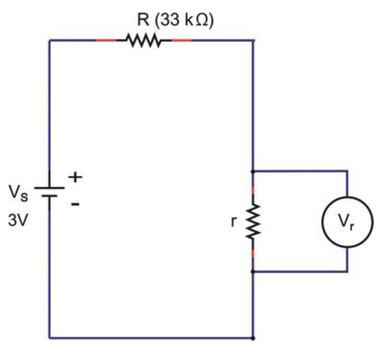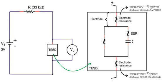 The zero charge-discharge profile of devices having Orgacon PEDOT:PSS, as observed in Figure 8 and Figure 9, suggested the absence of capacitive behavior in the system, which resulted in the absence of charging and discharging voltage. The polymer of Orgacon ICP 1050, which is a very good conductor, acted as a resistor with very low resistivity, even with a short circuit, while the electrodes themselves were still perfect. With this assumption, a schematic circuit depicting the measurement of Orgacon device showing no capacitive behavior is presented in Figure 10. It should be noted that the circuit is only a simplification of the system, where the device behaved as a wire instead of a TESD. In the simplified circuit, R is the external resistance of the system, and Vs and Vr are the source and device output voltages, respectively. Here, the device is represented only by its internal resistance r. By following the Kirchhoff’s Law, as the total potential difference in the system is zero, , the mathematical relationship between all the elements can be derived using the following formula: