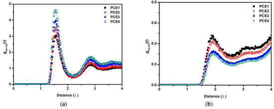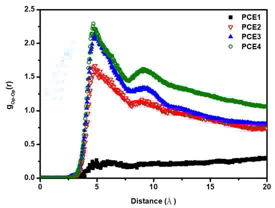 To analyze the interaction between PCE molecules, various radial distribution functions (RDFs) were calculated. RDF shows the local structure and understanding the atomic distribution of substance, which obtains the effective intermolecular potentials and the probability between two objects [27,28]. The intermolecular relationship between PCE molecules is shown in Figure 4; Op denotes the oxygen atom on the PCE molecule. Figure 4 shows that the interaction between PCE molecules increased with increasing side chain length of PCE. The side chain of PCE molecules aggregate in a homogeneous manner, which makes the steric hindrance between PCE molecules more obvious. The intensity of the steric effect decreases in the following order, PCE4 > PCE3 > PCE2 > PCE1. The results are consistent with the observations in Figure 3.