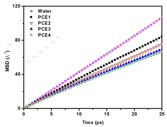 Water molecules play an important role in concrete system. The water molecules affect the hydration as well as dispersion of cement. The PCE molecules as a surfactant help cement particles disperse easily in aqueous systems [29,30]. Therefore, the relationship between PCE molecules and water molecules is worth exploring. To investigate the mobility of water molecules, the mean square displacement (MSD) was calculated, and the diffusion coefficient of the particles was calculated from the slope of the MSD [31].