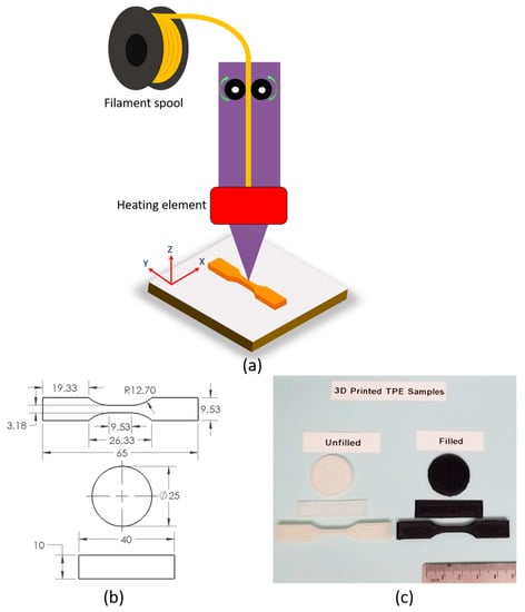 (a) Typical scheme of the 3D printing process, (b) drawing of specific sizes and shapes of the samples (tensile test, rheological test, and dynamic mechanical test) for 3D printing. All units are in mm. (c) 3D printed thermoplastic elastomers (TPEs) samples from 40 PP/60 SEBS (w/w) blend composition (unfilled and carbon black filled).