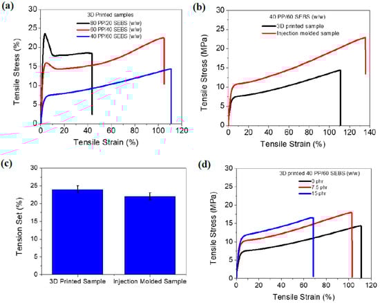 Mechanical properties of 3D printed blends: (a) Tensile stress vs. strain of 3D printed PP/SEBS blends having various blend ratios, (b) tensile stress vs. strain of 3D printed vs. injection molded TPE, (c) tension set of 3D printed vs. injection molded TPE, (d) tensile stress vs. strain of carbon black filled 3D printable TPE (loading of carbon black was varied from 0 to 15 parts per hundred rubber (phr)).