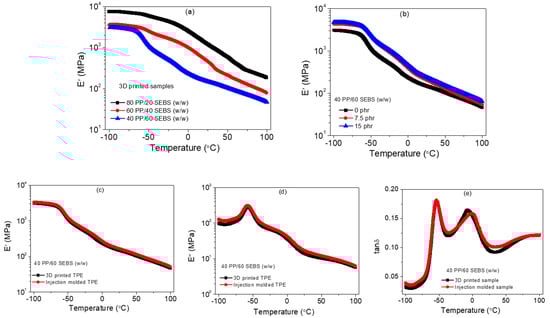Dynamic mechanical properties of the blends in the temperature range of −100 to +100 °C: (a) Storage modulus (E′) vs. temperature of 3D printed PP/SEBS blends, (b) storage modulus (E′) vs. temperature of carbon filled loaded 3D printed TPE (loading of carbon black was varied from 0 to 15 phr) (c) storage modulus (E′) vs. temperature of 3D printed TPE vs. injection molded TPE, (d) loss modulus (E′′) vs. temperature of 3D printed TPE vs. injection molded TPE, and (e) loss tangent (tanδ) vs. temperature of 3D printed TPE vs. injection molded TPE.