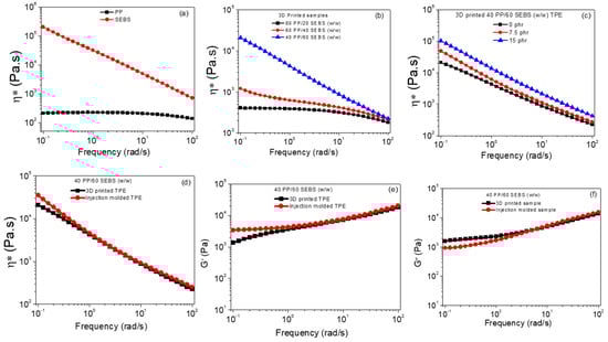 A rheological investigation of TPEs was necessary to optimize the processing conditions as the properties could depend on processing operations [,]. The viscosity behavior of the pure PP and SEBS, and their blends were examined using melt rheology as shown in Figure 5. Each experiment was performed at least three times from the same composition. The representative flow curve is provided here. The experimental standard deviation of complex viscosity and dynamic moduli were in the range of 3% to 4%. SEBS had a higher value of complex viscosity than PP in the entire frequency range tested (0.1 to 100 rad/s). Therefore, the lower viscosity PP would have a tendency to form the matrix in the PP/SEBS blends (discussed in the forthcoming section). Interestingly, SEBS had more shear thinning behavior than PP. This was due to more orientation and disentanglement of SEBS chains than PP with increasing shear rate []. All samples showed non-Newtonian shear thinning behavior. The frequency sweep curves of the printable blend samples are shown in Figure 5b–f.
