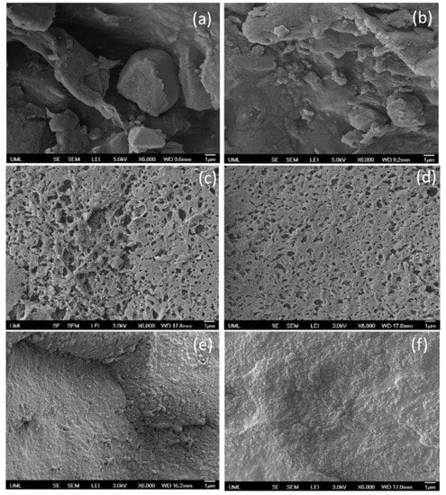 Morphology as observed by field emission scanning electron microscopy (FESEM) for (a) cryo-fractured surface of 3D printed 40 PP/60 SEBS (w/w) binary blend, (b) cryo-fractured surface of injection molded 40 PP/60 SEBS (w/w) binary blend, (c) etched morphology of the 3D printed 40 PP/60 SEBS (w/w) binary blend, (d) etched morphology of the injection molded 40 PP/60 SEBS (w/w) binary blend, (e) cryo-fractured surface of 7.5 phr carbon black loaded 3D printed 40 PP/60 SEBS (w/w) binary blend, and (f) cryo-fractured surface of 15 phr carbon black loaded 3D printed 40 PP/60 SEBS (w/w) binary blend.