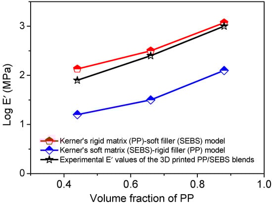 Storage modulus vs. volume fraction of PP. Kerner’s model was applied to predict the droplet-matrix morphology. Experimental storage modulus was compared with the storage modulus obtained using Kerner’s model.