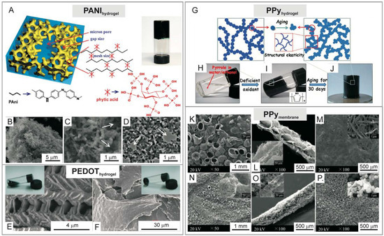 (A) Chemical structure and morphological characterization of phytic acid-gelated and doped PANIhydrogel. A photograph of PANIhydrogel inside a glass vial. (B–D) Scanning electron microscopic (SEM) images and transmission electron microscopic image of PANIhydrogel [141]. (E,F) SEM images of PEDOThydrogel morphology synthesized in the presence of different oxidants [147]. (G) Schematic illustration of the synthesis of PPyhydrogel via chemical oxidation. Photographs of (H,I) synthesis of PPyhydrogel inside glass vials and (J) formed PPyhydrogel [148]. (K–P) SEM images of PPymembrane synthesized by template-assisted polymerization [149]. Reprinted with permission from References [141,147,148,149]. Copyright 2019 PNAS, Nature Group, Royal Society of Chemistry and American Chemical Society.