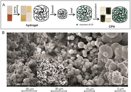 (A) Schematic illustration of the synthesis process for a hybrid hydrogel composed of supporting polymer and CPs. The deswelled hydrogel is immersed into the CP solution and absorbs monomers until it reswells to its original volume. Then, the reswelled hydrogel is immersed into a solution containing an oxidative initiator and dopants, allowing the in situ polymerization of CPs. The photos show different stages of hydrogel formation (our results not published). (B) Scanning electron microscopic images with different magnifications of aero-sponge like composites formed from different hydrogels (our results not published).