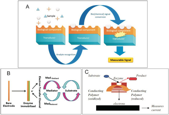 (A) Scheme of a biosensor [210]; (B) Schematic representation showing a biosensor operating with a mediator [211]; (C) Schematic representation of electron transfer (ET). An enzyme catalyses a redox reaction of a specific analyte, which results in the reduction of the CP (transducer) and the measurement of current [208]. Reprinted with permission from References [208,210,211]. Copyright 2019 MDPI and Elsevier.