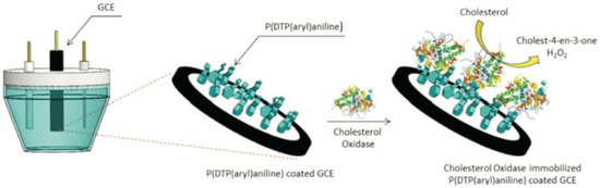 An amperometric cholesterol biosensor was constructed based on ChOx immobilized on a conducting 4-(4H-dithienol[3,2-b:2′,3′-d]pyrrole-4)aniline (DTPPy(aryl)PPyA) polymer [220]. Glassy carbon electrodes (GCE) were modified with DTPPy(aryl)PPyA and ChOx following the procedure presented in Figure 5. Analytical performance, such as linear range (2.0–23.7 μM), detection limit (0.27 μM), limit of quantification (0.82 μM) and the Michaelis-Menten constant (Km) (17.81 μM), of the biosensor electrodes was determined. The biosensor showed good reusability and long-term stability, indicating good orientation of the enzyme on the electrode surface and the biocompatible character of the polymer.