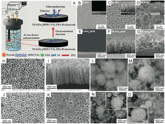 (A) Schematic illustration of glucose biosensor (Nf-GOx-fMWCNTs-PPy electrode) fabrication via a one-step in situ polymerization method [238]. (B–D) Planar and side direction (inset) field-emission (FE) SEM images of PPy nanostructures with different polymerization reaction times (3, 25 and 45 min, respectively) [239]. (E–G) Side-direction FE-SEM images of acid-treated PPy nanostructures (3, 25 and 45 min, respectively) [239]. FE-SEM images of (H) a top surface view and (I) a cross section view of a TiO2NT array, (J) a top surface view of PPy/TiO2NT and (K) the GOD/PPy/TiO2NT electrode [241]. SEM images of (L) Co3O4 and (M–O) Co3O4/PPy composites with different concentrations of PPy (5, 20 and 40%) [242]. Abbreviations: Nf (Nafion); fMWCNTs (functionalized multi-walled carbon nanotubes). Reprinted with permission from References [238,239,241,242]. Copyright 2019 Nature Group, American Chemical Society and Elsevier.