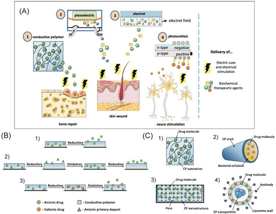 The conductive properties of CPs make them an important class of materials for a wide range of applications [7,8], mainly in energy storage [9,10,11,12] electronic and photovoltaic devices [13], electrochromic displays [14,15], electrocatalysis and photocatalysis [16,17], and sensors [18,19,20,21,22,23], etc. CPs have garnered increasing attention in biomedicine because they can convert different types of signals into electrical signals. Since the 1980s, when it was found that these materials are compatible with many biological molecules, their biomedical applications have expanded greatly [24]. Due to their excellent biocompatibility, these “smart materials” may be used in different areas of biomedicine [25,26], such as cell (cell growth and cell migration) and tissue engineering, biosensors, drug and gene delivery systems, artificial muscles, and diagnostic applications [27,28,29,30,31,32,33], etc.