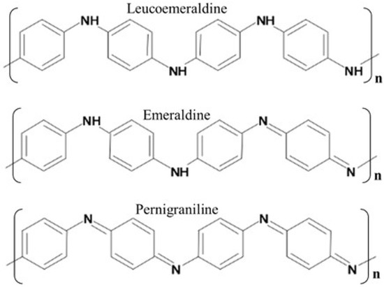 Repeatable units of polyaniline (PANI) in the most common polymer forms [61]. Reprinted with permission from Reference [61]. Copyright 2019 MDPI.