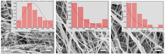 Scanning electron microscopy (SEM) images of nylon 6 nanofiber at different solution concentrations, (a) 12 wt %, (b) 15 wt % and (c) 18 wt %. Inset are their size distribution curves.