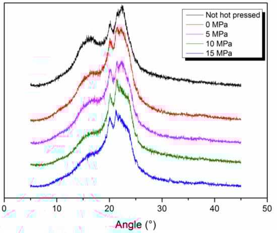 Hot pressing treatment has also an effect on the pore and fiber morphology of the composite nanofiber membrane. Figure 4 and Table 2 show the pore size distribution of HNM composited under the different pressures for the same areal density of nylon 6 nanofiber. As can be seen, as the pressure increases, the membrane pore size becomes smaller and the distribution becomes narrower. When the pressure is increased to 5 MPa, the pore size and pore size distribution change greatly and the average pore diameter decreases from 1.7437 μm to 1.6236 μm, which is due to the close packing of the fibers under pressure. When the pressure is increased to 10 MPa, the average pore size is reduced to 1.5947 μm and then 1.5363 μm at 15 MPa. The reason for this change is that not only the accumulation of fibers changes under high pressure but also the fiber morphology changes. As the pressure increases, the fibers change from the original loose state to a close packed state, achieving a reduction in the pore size. However, the reduction of the fiber accumulation state is limited. Continuing to increase the pressure has a smaller effect on the pore size but it is easy to partially melt or deform the fiber to reduce the pore size. Figure 5 shows the XRD patterns of HNM composited under different pressures. It can be seen that the crystallization peak and crystallinity of nylon 6 nanofiber change little before and after hot pressing, indicating that the fiber membrane melt change under hot pressing is small, so 180 °C, 15 MPa and 10 s are set as parameters for subsequent work.