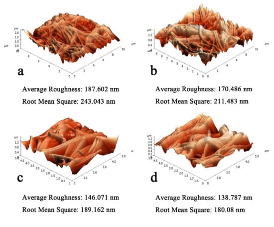 Apparent structure diagram (AFM) of different areal densities of HNM: (a) 4.3 g/m2, (b) 6.7 g/m2, (c) 9.4 g/m2, (d) 14.1 g/m2.