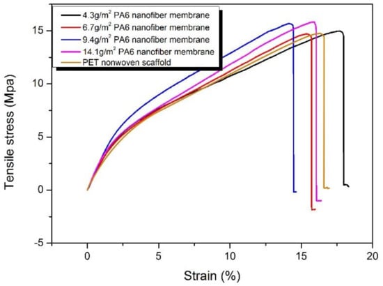 Figure 8 shows the tensile fracture of different areal density HNM. Since the HNM is supported by the same PET nonwoven fabric, the strength of the four porous scaffold is not much different. The HNM strength with areal densities of 4.3 and 6.7 g/m2 was similar to that of pure PET non-woven fabric and the HNM strength with areal density of 9.4 and 14.1 g/m2 was slightly increased. This is because, during hot pressing, the nanofibers will be filled into the pores of the non-woven fabric under temperature and pressure conditions and the mechanical properties of the non-woven fabric may be deformed or melted to form a mechanical lock, so that the overall strength is improved.