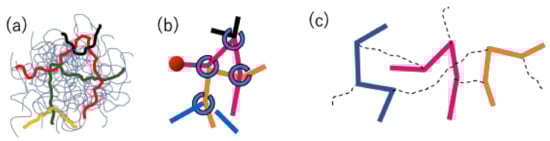 For the DT model, the connection between chains in real-space is not considered. Namely, the chains are separately managed from each other as shown in Figure 2c. The pairing between chains via slip-links is maintained in a book-keeping manner. However, the distance between chains in real space is not considered for the pairing. Due to this model construction, the force balance around entanglement is not considered. Indeed, under a deformation, the slip-link position and the segment vector change affinely, and no relaxation takes place except the reptation of the chain and CR by the partner chain.