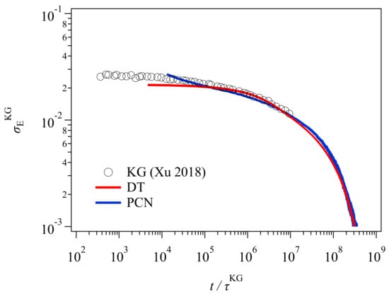 Figure 3 shows the stress relaxation after the uniaxial deformation. Here, for conversion of time and stress, the conversion factors previously obtained [,] were used for the PCN result. For the DT result, the conversion factors were obtained from the comparison to the PCN result as explained in the Appendix A. The conversion relationships used for time and stress (modulus) are as follows.
