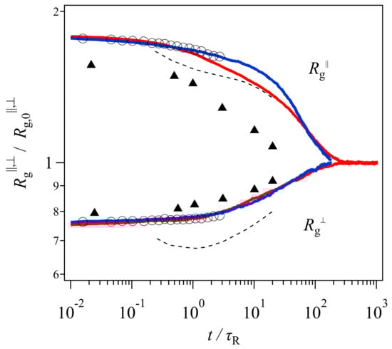 Time development of gyration radius parallel (top) and perpendicular (bottom) to the stretching direction. The gyration radius and time are normalized by the equilibrium value and the Rouse time, respectively. Circles and triangles show the data from the bead-spring simulations and the experiment. The dashed curve indicates the prediction by the GLaMM model. These data were extracted from the paper by Xu et al. [] Red and blue curves are the results from the DT and PCN simulations, respectively.
