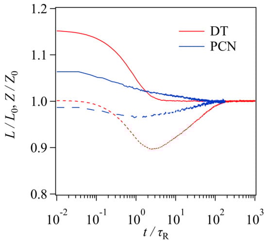 Although the gyration radius does not show the non-monotonic behavior in the DT and PCN simulations, the chain contraction assumed in the tube picture is observed as demonstrated in Figure 5, in which the tube contour length and the entanglement density are seen. For the DT simulation, the tube contour (solid red curve) clearly shows the contraction, as it decays with the characteristic relaxation time identical to the Rouse time. Due to this chain contraction, the entanglement density decreases (dashed red curve). After the chain contraction, the entanglement density revives to the equilibrium value via the reptation motion with the longest relaxation time. These chain dynamics are the same as those assumed in the tube framework []. The chain contraction occurs for PCN as well (see solid blue curve). However, the relaxation occurs in a two-step manner, as reported earlier by Furuichi et al. [,,,]. For the two relaxation processes, the characteristic time is close to the Rouse time and the longest relaxation time, respectively. The long-time contraction in PCN induces the difference in shown in Figure 4, in which for PCN is retarded to that for DT in . The origin of this slow relaxation is the propagation of orientational relaxation via the force balance around entanglement. The entanglement density (dashed blue curve) decreases due to the chain contraction, and it shows a minimum around the Rouse time as with DT. However, the magnitude of the decrease is much smaller. These differences between the models are not seen in the gyration radii, as with the stress shown in Figure 3 and Figure 4. This result implies that the gyration radius is not strongly sensitive to the difference in molecular motion, such as chain contraction and loss of entanglement.