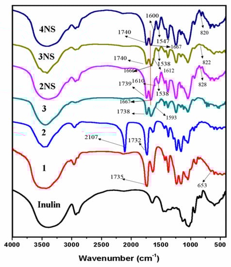 The structures of inulin and the inulin derivatives were determined using FTIR, 13C NMR, and 1H NMR spectroscopy. The FTIR of inulin and all the inulin derivatives was shown in Figure 1. As shown in Figure 1, the spectrum of inulin showed that the saccharide mainly contains the following characteristic band: 3385 cm−1, 1030 cm−1, and 868 cm−1 []. In the 6-bromo-6-deoxy-3,4-acetyl inulin (1), the new peaks at 1735 cm−1 and 653 cm−1 were assigned to C=O and C–Br, respectively. After the chemical reaction between 6-bromo-6-deoxy-3,4-acetyl inulin and NaN3, a new strong peak at 2107 cm−1 was attributed to the stretching vibration of the azido group []. After reduction of the azido group using Ph3P, the peak at 2107 cm−1 disappeared in 6-amino-6-deoxy-3,4-acetyl inulin (3). Meantime, the new peak at 1593 cm−1 was assigned to the absorption of NH2 []. In the spectra of Schiff bases of inulin, except for the carbonyl peak at 1740 cm−1, the new peaks at 1610, 1538, 828 cm−1, 1612, 1538, 822 cm−1, and 1600, 1547, 820 cm−1 were assigned to the pyridine rings in 2NS, 3NS, and 4NS, respectively []. The characteristic peak of C=N was observed at 1667 or 1666 cm−1 []. The above results preliminarily demonstrated that Schiff bases of inulin were obtained.