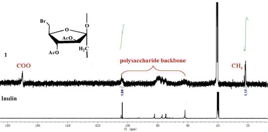 13C nuclear magnetic resonance (13C NMR) spectra of inulin and 6-bromo-6-deoxy-3,4-acetyl inulin (1).