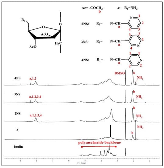 The 1H NMR spectra of inulin and all Schiff bases of inulin are shown in Figure 3. It has been known that the peaks at δ = 3.0–5.2 ppm were assigned to the absorption peaks of protons in the fructose and glucose skeleton of inulin []. The peak at δ = 5.2 ppm was assigned to the α-anomeric forms of free glucose []. The signal of protons at 1.8 ppm was assigned to the primary amino groups in 3 []. In 2NS, 3NS, and 4NS, multiple peaks at δ = 7.7–8.6 ppm were assigned to the pyridine ring and CH=N []. Besides, the peak at δ = 2.1 ppm revealed the presence of the CH3–C=O group. The absorption peak at δ = 1.9 ppm indicated the residual amino group. The 1H NMR spectra further confirmed the successful synthesis of Schiff bases of inulin.