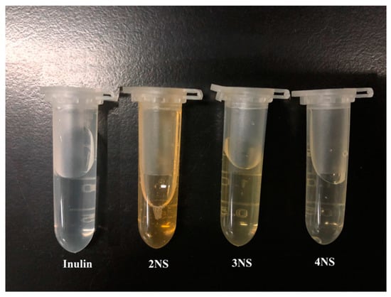 Inulin, 2NS, 3NS, and 4NS all had good solubility in water (Figure 4) and were prepared as solutions at room temperature. The antifungal activities of inulin, 6-amino-6-deoxy-3,4-acetyl inulin (3), 2NS, 3NS, and 4NS against B. cinerea, F. oxysporum f.sp.niveum, and P. asparagi were investigated by measuring the growth rate of mycelium in vitro. The concentration of all the samples was prepared from 0.1 to 2.0 mg/mL. Carbendazim was used as a positive control in this study. The antifungal indices are shown in Figure 5, Figure 6 and Figure 7.