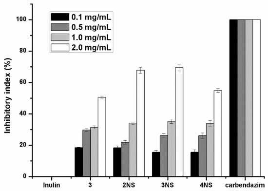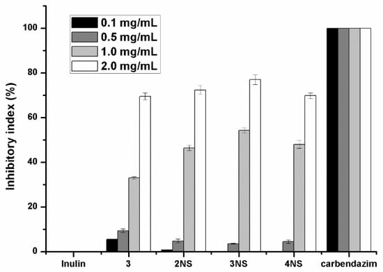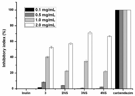 The inhibitory indices of inulin and the inulin derivatives against P. asparagi and F. oxysporum f.sp.niveum are shown in Figure 6 and Figure 7, respectively. Carbendazim also exhibited prominent antifungal activity against P. asparagi and F. oxysporum f.sp.niveum even at 0.1 mg/mL. Figure 6 shows the antifungal activity of inulin, 6-amino-6-deoxy-3,4-acetyl inulin (3), 2NS, 3NS, and 4NS against P. asparagi. The results were almost similar to the antifungal activity against B. cinerea. Firstly, inulin as a nutrition polysaccharide had no marked inhibition of fungi growth even at 2.0 mg/mL. Secondly, the inhibitory indices of all the inulin derivatives were in a concentration-dependent manner. Thirdly, the compound 3 and all Schiff bases of inulin exhibited enhanced antifungal activity than inulin especially at 2.0 mg/mL, which was attributed to the introduction of the active group such as the amino group and the pyridine ring. Besides, the Schiff bases of inulin especially 2NS and 3NS with inhibitory indices >67% showed relatively better antifungal activity than 6-amino-6-deoxy-3,4-acetyl inulin (3). The antifungal activities of inulin and the inulin derivatives against F. oxysporum f.sp.niveum are shown in Figure 7. The results were similar to the above results against B. cinerea and P. asparagi. Inulin didn’t show any antifungal activity against F. oxysporum f.sp.niveum under the tested condition. Besides, the inhibitory indices of the inulin derivatives mounted up with the increasing concentration. The inhibitory indices of 6-amino-6-deoxy-3,4-acetyl inulin (3), 2NS, 3NS, and 4NS could reach 52.4%, 57.4%, 70.9%, and 66.5% at 2.0 mg/mL, respectively. All the inulin derivatives showed more enhanced antifungal activity than inulin, especially at 2.0 mg/mL. Besides, as illustrated by the data, the introduction of Schiff bases was more significant for enhancing the antifungal activity of inulin.