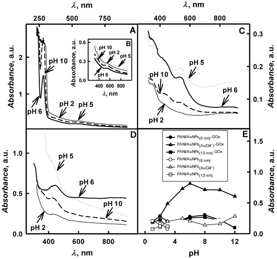 Spectra of PANI/AuNPs-GOx formed in the presence of AuNPs(6nm), AuNPs(13nm) and AuCl4− (A,B,C,D) and the influence of pH on the absorbance maximum at λ = 450 nm during the enzymatic polymerization and auto-polymerization in the absence of GOx (E). (Polymerization solution composition: 0.05 mol L−1 glucose, 0.50 mol L−1 aniline, 0.75 mg mL−1 glucose oxidase and AuNPs(6nm) (A,B), AuNPs(13nm) (C) and 0.6 mmol L−1 AuCl4− (D); 2 days of enzymatic polymerization. The wavelength interval of spectra in B is in the range from 320 to 900 nm. Optical absorbance (E) was registered in 0.05 mol L−1 SA buffer, pH 6.0).