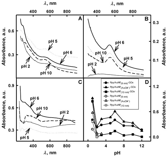 The influence of pH value of polymerization solution on optical absorbance during the formation of Ppy/AuNPs-GOx nanocomposites was investigated in the next stage of our investigations. During 2-days lasting enzymatic formation of Ppy/AuNPs-GOx nanocomposites at pH values ranging from 1.0 until 12 in the presence of AuNPs or AuCl4− ions were intensively black coloured and solutions above a sediment consisting of aggregated Ppy/AuNPs-GOx become dark green. Dark colour of formed Ppy-based nanocomposites is characterized for advanced π-conjugated system [28]. As it is seen from Figure 4A–C the absorbance was observed for spectra of formed Ppy/AuNPs-GOx nanocomposites at λ = 265 nm, λ = 312–361 nm, λ = 414 nm and λ = 560 nm, what is in an agreement with spectra of chemically synthesized polypyrrole [23,33,34]. The peak at λ = 265 nm is associated with the π-conjugated structure of pyrrole rings, at λ = 312–361 nm and at λ = 414 nm—with π-π* transition of the polypyrrole‘s chain [23,33,34]. The peak at λ = 560 nm is attributed to a transition from the valence bond to the antibonding polaron- or bipolaron-state and reveals that ultra-small clusters of AuNPs and Ppy are formed [23,33,34]. By the increase of pH value the optical absorbance at λ = 265 nm and λ = 312–361 nm was changed just slightly but at λ = 414 nm and λ = 560 nm changes of optical absorbance were very significant. The absorbance at λ = 414 nm is characteristic for the early stage of pyrrole oxidation.