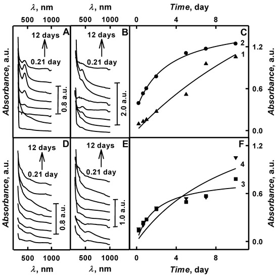 Spectra registered during enzymatic synthesis of aniline (A,B) and pyrrole (D,E) in the presence of various gold-containing compounds and the influence of polymerization duration on optical absorbance of formed nanocomposite colloidal solutions (C,F). (Polymerization solution composition: 0.05 mol L−1 glucose, 0.50 mol L−1 aniline (A,B,C) or pyrrole (D,E,F), 0.75 mg mL−1 glucose oxidase and AuNPs(6nm) (A,D) or 0.6 mmol L−1 AuCl4− (B,E). Optical absorbance was registered in 0.05 mol L−1 SA buffer, pH 6.0. (C) 1,2 curves – PANI/AuNPs(6nm)-GOx and PANI/AuNPs(AuCl4−)-GOx; (F) 3,4 curves – Ppy/AuNPs(6nm)-GOx and Ppy/AuNPs(AuCl4−)-GOx.).