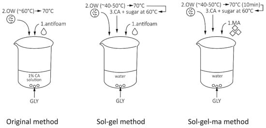 The “sol-gel-ma method” was a further step in which maleic anhydride, as a potential crosslinking agent, was also incorporated into the recipe of the sol-gel method, while antifoam was removed to reduce the number of chemicals. In the sol-gel-ma method, different concentrations of maleic anhydride (100, 50, 25, 12.5, 6.25, 3.13, and 1.56 (w/w) %) were used in the preliminary experiments, and maleic anhydride was added to distilled water as one of the initial ingredients, together with glycerol. All other steps and concentrations were the same as in the sol-gel method. A schematic image of the different methods is presented in Figure 1.