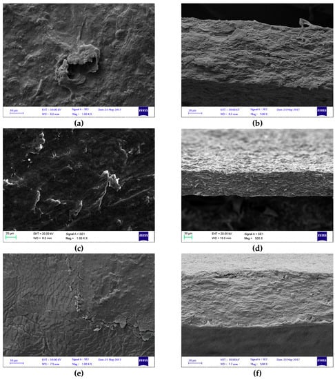 Surface and transversal morphology was studied by field emission scanning electron microscopy (FE-SEM) (Zeiss, Sigma, Jena, Germany) imaging. For surface visualization, films were attached to a carbon tape and covered with gold. For transversal visualization, cross-sectional images of films were taken as follows: films were immersed in liquid nitrogen for one minute before they were broken and immediately attached to a carbon tape and covered with gold. Photomicrographs were taken at 500, 1.00, 5.00, and 10.00 K × magnifications using an accelerating voltage of 10.00 and 20.00 kV.