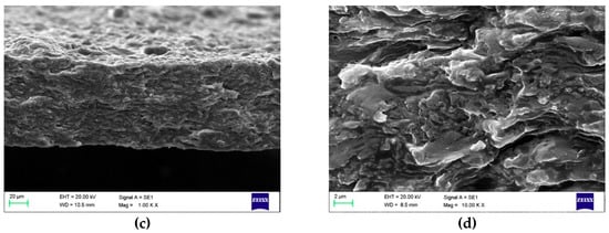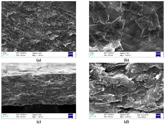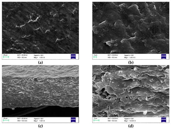 FE-SEM micrographs of film surfaces with a magnification of 1.00 K × (a) and 5.00 K × (b) and cross-sectional images with a magnification of 1.00 K × (c) and 10.00 K × (d) containing the highest concentration of maleic anhydride (1.56%) prepared according to the sol-gel-ma method (both glycerol and sugar concentrations were 7%).