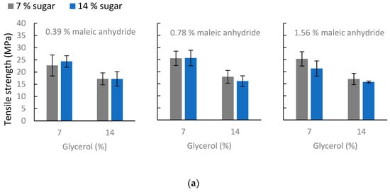 Glycerol appears to have a significant negative effect (coefficient −3.64, p = 0.000) on the tensile strength (Figure 6a) when increased from low (7%) to high (14%) concentration, as was expected. Sugar and maleic anhydride (p = 0.213 and p = 0.231, respectively) did not have any significant effect on tensile strength.
