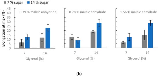 The elongation values are clearly more complicated, as a number of mechanisms may be involved in the plasticization of bioplastics with low molecular weight compounds [27]. Elongation was significantly affected by glycerol (the reverse effect of that for tensile strength, as expected) and sugar (coefficient 5.52, p = 0.000 and coefficient 3.57, p = 0.000, respectively). Their interaction also had a significant positive effect on elongation (coefficient 2.18, p = 0.000). This result, in the observed pattern of high glycerol and high sugar levels, gives the highest elongation for all maleic anhydride levels (Figure 6b). The effect of maleic anhydride concentration on elongation is made up of a main effect and varying interaction effects. The maleic anhydride main effect on elongation and the maleic anhydride*sugar interaction are both significant. When maleic anhydride was used at a low (0.39%) concentration, the effect on elongation was negative (coefficient −1.76, p = 0.013). When maleic anhydride was used at a concentration of 0.78%, the effect was positive (coefficient 1.72, p = 0.015), and when it was used at a concentration of 1.56%, the effect was also positive but smaller than at the middle level (0.78%) (coefficient 0.046, p = 0.946). The maleic anhydride*sugar interaction was most noticeable when 0.78% maleic anhydride was used (coefficient 2.18, p = 0.03). From the general linear model, significant positive effects were found for high (14%) sugar and glycerol levels, and a positive sugar*glycerol interaction for this combination was also found. Furthermore, the modelled values and 95% confidence intervals calculated for the different maleic anhydride concentrations at the highest levels of glycerol and sugar (14%) were 24.16 (21.2, 27.23), 27.24 (24.18, 30.30), and 28.71 (25.65, 31.77) for 0.39%, 0.78% and 1.56% maleic anhydride, respectively.